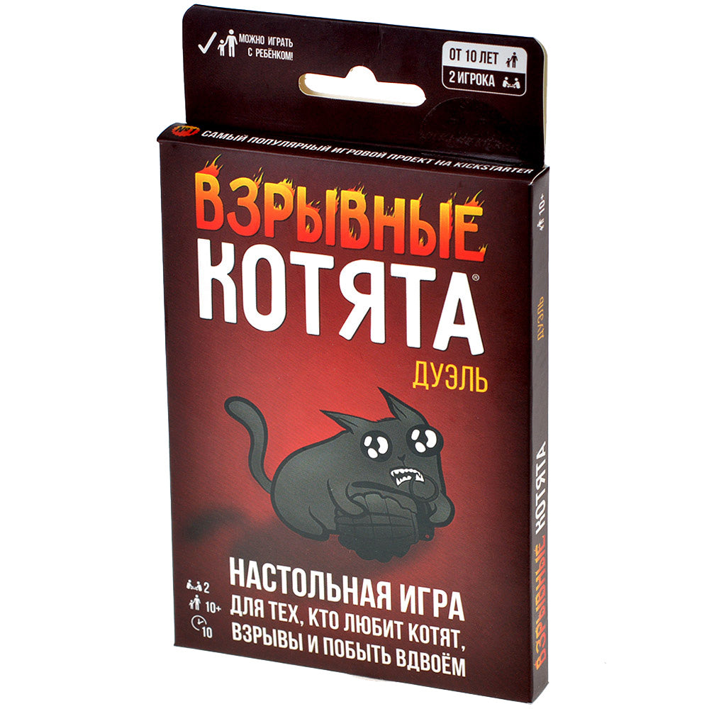 "Взрывные котята: Дуэль" – это новая версия мирового хита, что позволит взглянуть на игру с совершенно новой стороны. Если классические "Взрывные котята" играются тем веселее, чем больше людей, то в "Дуэль", как можно догадаться, могут играть лишь двое. Но, поверьте, накал страстей от этого лишь возрастёт! Грядёт настоящая битва (кошачьих) умов, где каждый ход может стать решающим, а от каждой карты может нешуточно пригореть. От злости и обиды.