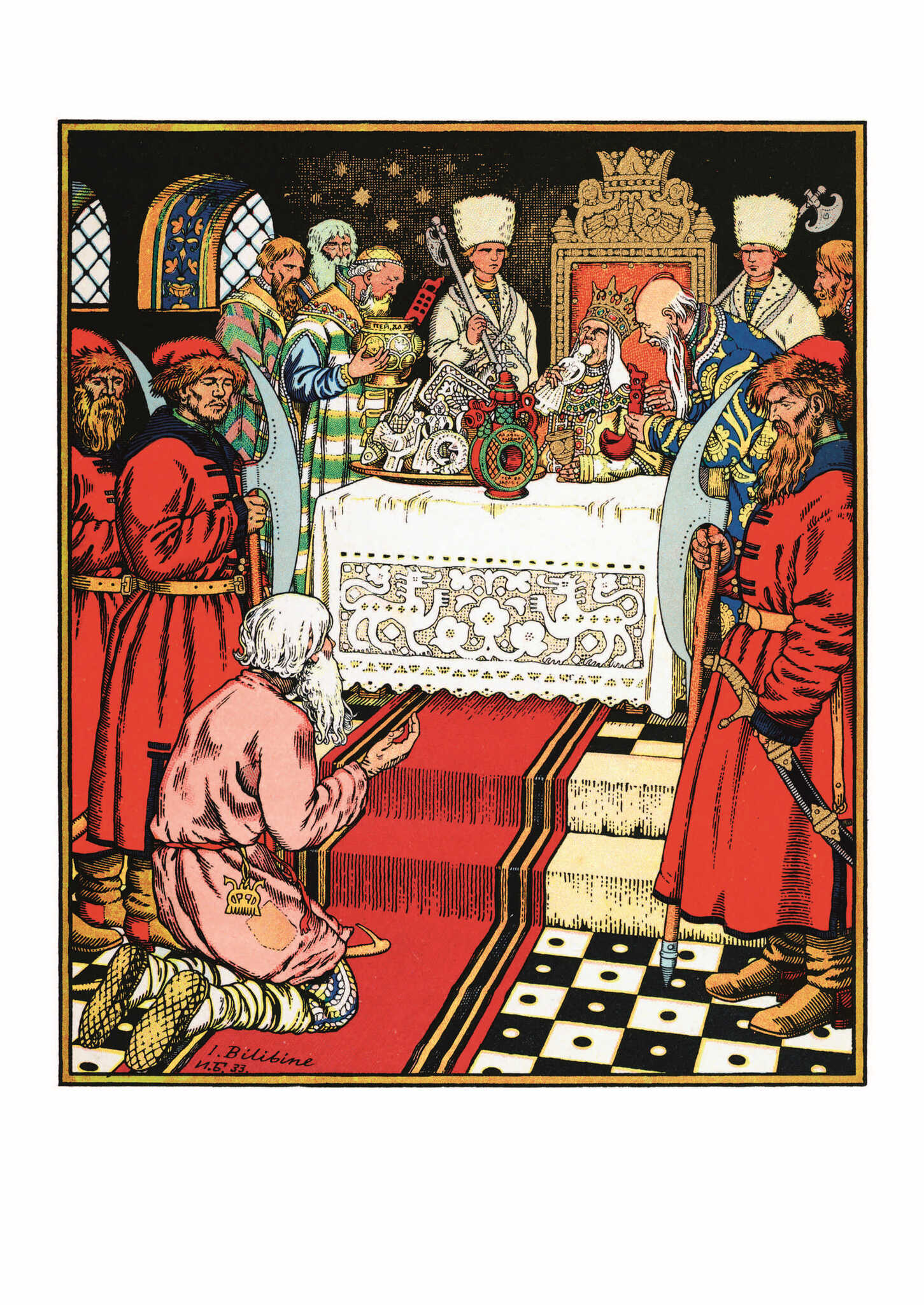 Иллюстрации к русским сказкам Билибина заметил князь Б. Б. Голицын, возглавлявший в конце XIX века так называемую «Экспедицию заготовления государственных бумаг». Под ее эгидой Голицын мечтал выпускать высококачественную печатную продукцию, которая способствовала 6ы эстетическому развитию народа. Рисунки Билибина как нельзя лучше соответствовали этой цели. Сотрудничество художника с «Экспедицией» продолжалось несколько лет. По заданию этнографического отдела Музея Александра III Билибин посетил Вологодскую, Олонецкую и Архангельскую губернии, где изучал деревянное зодчество. В начале ХХ века заставки, концовки, обложки и другие работы Билибина стали появляться в таких журналах как «Мир Искусства» и «Золотое Руно». Суровые ветры революции 1917 года заставили Билибина покинуть Россию. Он жил и успешно работал сначала в Каире, потом в Париже. Однако желание вновь оказаться на родине было так велико, что в 1936 году художник переехал в Ленинград. В этом городе он и умер зимой 1942 года от истощения, отказавшись после начала войны от предложенной ему властями эвакуации.