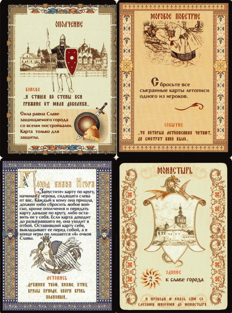 В «Князьях» пять видов карт: города, постройки, события, летописи и войска. Города — основа княжеского владения: именно они и воздвигнутые в них постройки дают львиную долю очков славы. События представляют собой разнообразные происшествия: вы можете сжечь все постройки в чужом городе, переманить вражескую армию на свою сторону или украсить карты из руки противника. Войска нужны для захвата чужих городов, а также для того, чтобы использовать некоторые карты летописей и событий. Летописи, будучи раз сыгранными, остаются до конца игры. Они могут приносить или отбирать очки славы, усиливать ваши войска или давать вам преимущества в ходе игры. Особая летопись «Татарское нашествие» позволяет завершить игру досрочно, в выгодный игроку момент.
