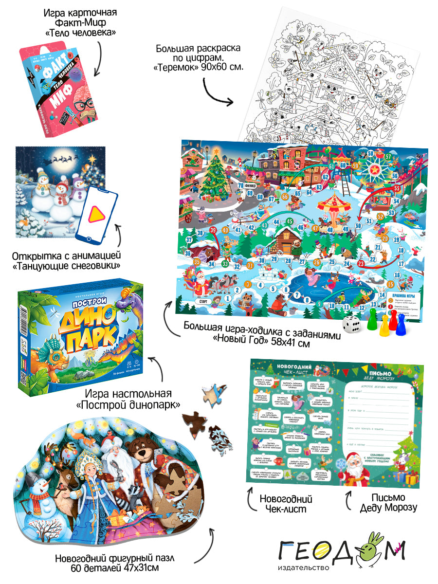 Большой подарок «Новогодний сюрприз» – это 8 в 1 для создания волшебного праздника! В комплекте: большой пазл, игра-ходилка с заданиями, письмо Деду Морозу, новогодний чек-лист, настольная игра на развитие стратегического мышления, карточная игра, большая раскраска по цифрам и открытка с дополненной реальностью. Проведите время с семьёй и друзьями весело и интересно! Рекомендованный возраст: 6+.