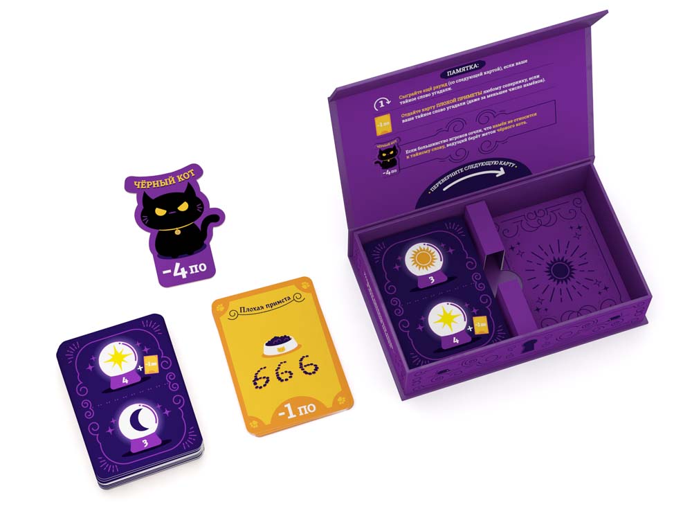 В состав настольной игры Последний намек входит: 110 карт со словами, 10 карт плохой приметы, 1 жетон чёрного кота