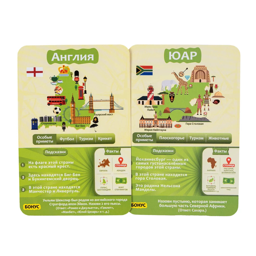 Рассекретив страну на карточке, вы всегда можете рискнуть и ответить на дополнительный вопрос. Если ответите на него верно, получите полезный бонус в следующем раунде — третью примету страны. Выглядит заманчиво, не правда ли? Но в случае ошибки — вы потеряете только что выигранную карточку. И это уже очень обидно!