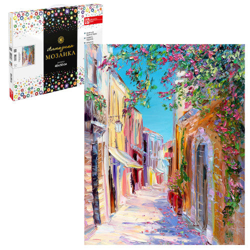 размер: 40*50 см, (24 цветов страз, холст на подрамнике с напечатенной картиной, покрытый клеевым слоем и защитной пленкой, пакеты со стразами, стилус, лоток для страз, силикон для страз, клей, подвесы для подрамника, пинцет металлический, схема, дополнительные пакеты с zip-молнией, стикеры для нумерации zip-пакетов в комплекте, форма страз: круглая, тип выкладки: полная, картонная коробка с ручкой)