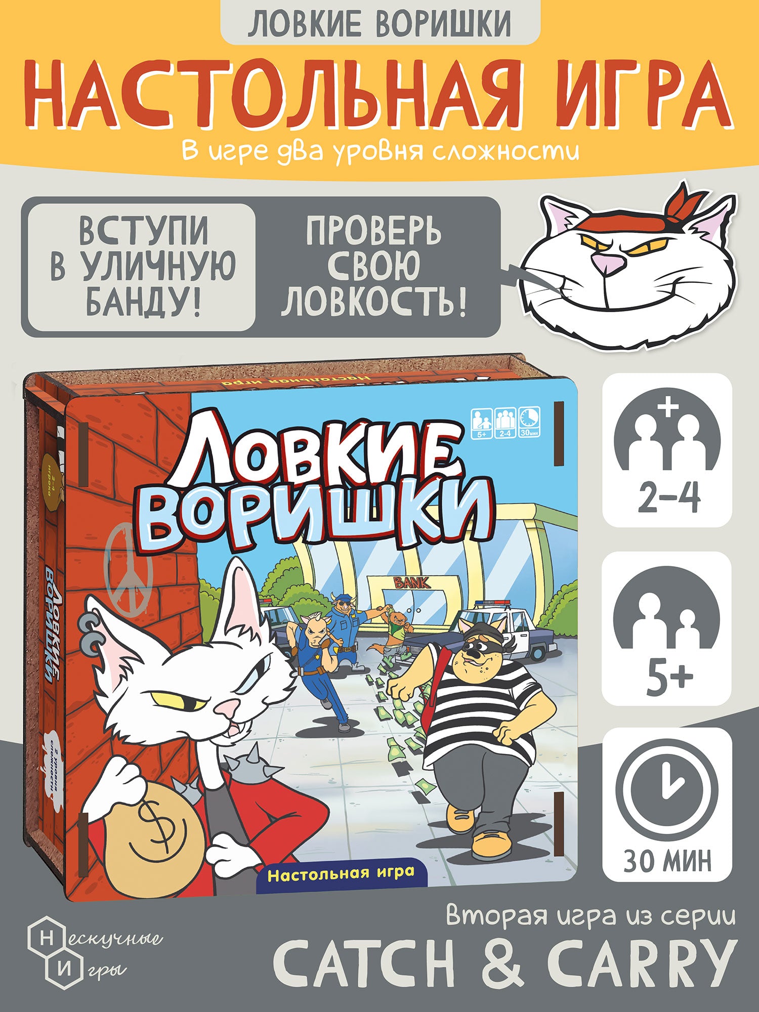 Настольная игра «Ловкие воришки» — это вторая игра в серии «Catch&carry». Дерзкие банды воришек грабят банки на улицах Энимал-сити. Хотите вступить в одну из уличных банд, проверить свою ловкость и хитрость, обойдя соперников и заполучить все ценности из хранилищ? Тогда вперёд! С каждым ходом ценностей остаётся все меньше и меньше, рассчитывайте свои ходы, собирайте как можно больше добычи и отрезайте пути движения противникам. Но будьте осторожны, банк патрулируют охранники! Победит тот, чья банда соберёт самый большой куш!