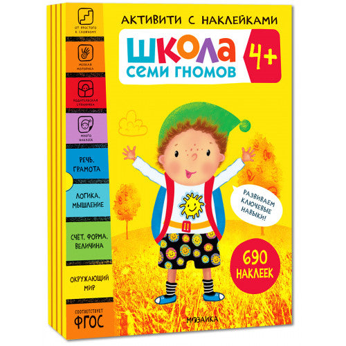 Школа Семи Гномов. Активити с наклейками. Комплект 4+. Серия "Школа Семи Гномов. Активити с наклейками" создана как расширение и дополнение базового курса "Школы Семи Гномов". Она отвечает за тренировку и закрепление знаний по основным образовательным областям. Развитие логического, математического мышления, грамоты и речи, знакомство с окружающим миром - это фундамент дошкольного обучения. Эти темы требуют особого внимания, и активити с наклейками идеально подходят для их проработки. В комплект входят 4 книги для детей от 4 до 5 лет. Разнообразные задания и большое количество наклеек не дадут ребенку потерять интерес к занятиям. А в помощь взрослому в каждой книге есть родительская страничка, которая содержит емкое, но лаконичное руководство к занятиям. Кроме того, в комплект входят лист с поощрительными наклейками, которые сделают процесс обучения еще интереснее. Все это упаковано в удобный футляр, который может служить и дальше для хранения книжек.